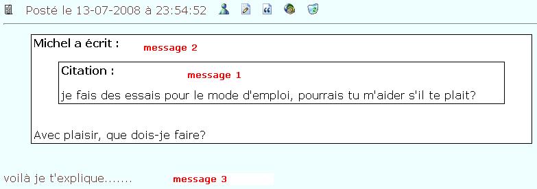 | Citer un message Syntaxe [ citation=pseudo de l'auteur]message cité[/citation] Comment faire ? Cliquer sur soit directement lors de la lecture. soit lorsque vous êtes dans l'encart de réponse Puis écrivez votre réponse On obtient ceci :