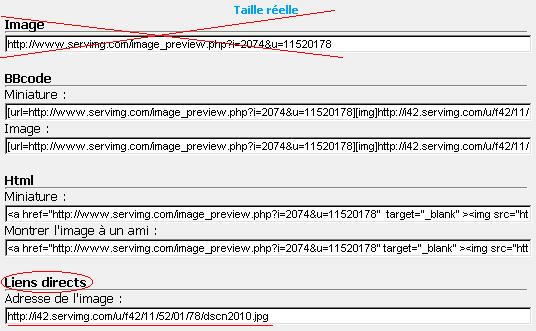| En effet, merci Tao Quand vous hebergez une image chez servimg , le mieux, sauf si vous souhaitez mettre une image sous forme de vignettes, auquel cas il faut prendre "BBCode > miniatures"ce qui n'est pas votre cas ici il vous faut prendre le " lien direct " : ce qu'a fait Tao; vous aviez pris "images" voici l'exemple avec une autre image: