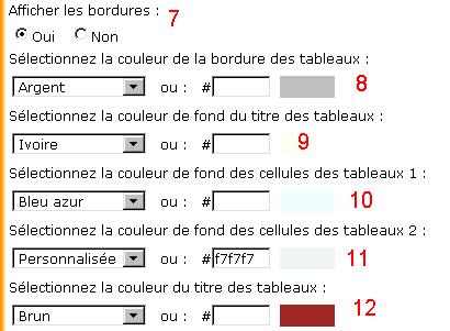 8 Choisissez la couleur des bordures si vous avez décidé de les laisser apparaitre 9 définit la couleur de fond des titres des tableaux: - fond de la partie supérieure de la liste des connectés - fond de la partie supérieure du message flash - fond du tableau de titre des groupes, Sujets, Messages, Dernier message, modérateurs etc... 10 définit la couleur du fond des cellules du tableau 1: page d'accueil: - fond de la partie inférieure de la liste des connectés - fond de la partie inférieure du message flash - fond des colonnes sujet, dernière page, réponses, vues, date du dernier message partie interne du forum: - fond des messages impairs etc... 11 définit la couleur du fond des cellules du tableau 2: page d'accueil: - fond de la colonne des catégories - fond de la colonne dernier message partie interne du forum: - fond des messages pairs 12 correspond à la couleur du texte des titres des tableaux - texte de la partie supérieure de la liste des connectés - texte de la partie supérieure du message flash - texte du tableau de titre des groupes, Sujets, Messages, Dernier message, modérateurs etc...