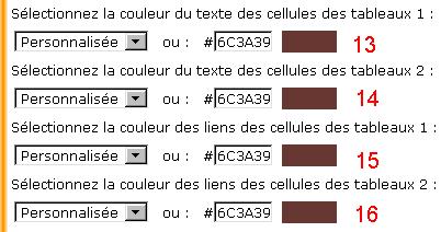 13 correspond à la couleur du texte des cellules des tableaux 1 page d'accueil: - texte de la partie inférieure de la liste des connectés - texte du message flash - texte des colonnes sujet, dernière page, réponses, vues, date du dernier message partie interne du forum: - fond des messages impairs etc... 14 correspond à la couleur des liens des cellules des tableaux 1 page d'accueil: - liens de la partie inférieure de la liste des connectés - liens de la partie inférieure du message flash partie interne du forum: - liens des messages impairs etc... 15 correspond à la couleur du texte des cellules des tableaux 2 page d'accueil: - texte de la colonne des catégories - texte de la colonne dernier message partie interne du forum: - texte des messages pairs 16 correspond à la couleur des liens des cellules des tableaux 2 page d'accueil: - liens de la colonne des catégories - liens de la colonne dernier message partie interne du forum: - liens des messages pairs