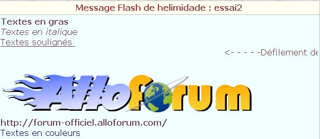 | Onglet " Messages Flash " AlloForum vous offre la possibilité de placer des messages flash sur la page d'accueil de votre forum. Dans la colonne grise de votre espace d'administration, cliquez sur "messages flash" puis sur "ajouter" commencez par renseigner le titre (ici =essai) puis le message (ici =essai pour le One)