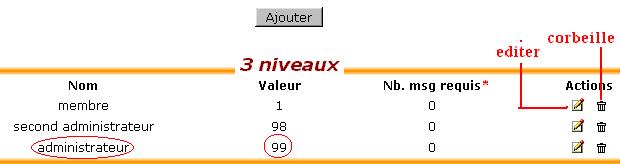 pour cela cliquez sur l'icône "éditer" pour modifier le nom du niveau, modifier la valeur du niveau (attention de bien respecter la hiérarchie des niveaux de votre forum), activer ou désactiver la progression automatique du niveau édité. Cliquez sur le bouton " Valider " pour que vos modifications soient prises en compte. pour supprimer un niveau, cliquez sur la "corbeille"