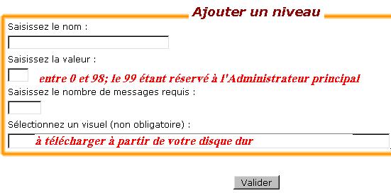 Saisissez le nom du nouveau niveau que vous souhaitez ajouter. Indiquez en dessous la valeur du niveau (nombre compris entre 1 et 98, le nombre 99 étant réservé à l'administrateur). Si vous souhaitez la progression automatique de ce niveau au niveau supérieur après que le membre aura posté x messages indiquez dans la case suivante la quantité de messages postés nécessaires Si vous ne souhaitez pas de progression automatique pour un niveau donné , vous devez impérativement mettre le chiffre 0 dans la case du nombre de messages requis*. Remarque : *Les membres atteignant ce niveau n'en changeront plus. Vous pouvez ajouter une icône de niveau si vous le souhaitez (facultatif) en la téléchargeant depuis votre disque dur (sans balises donc) Cliquez sur " Valider " pour que votre création de niveau soit prise en compte.
