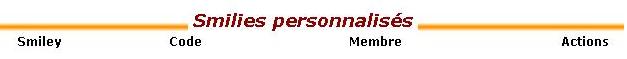 | Onglet " Smilies persos " Les membres de votre forum et vous-mêmes pouvez ajouter aux smilies personnalisés du forum votre propre smiley vous pouvez, si nécessaire, les supprimer dans votre espace d'administration > colonne grise: "smilies persos" si personne n'a téléchargé de smiley perso, vous aurez cette fenêtre: