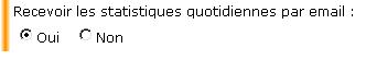 Cette fonction vous permet de consulter directement sur votre écran dans la zone administration les statistiques quotidiennes de votre forum. Il vous suffit pour cela de sélectionner dans les listes déroulantes la date du jour pour lequel vous voulez afficher les statistiques et cliquer ensuite sur le bouton OK . Par défaut lorsque vous entrez dans Statistiques , ce sont les statistiques du jour qui sont affichées. A noter que le total indiqué tout en bas de la page représente le nombre d'actions réalisées à cette date et non le nombre de messages postés. Remarque : il vous est possible d'activer et de désactiver l'envoi des statistiques quotidiennes de votre forum dans l'onglet "configuration"