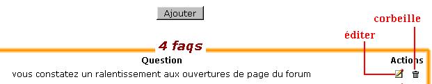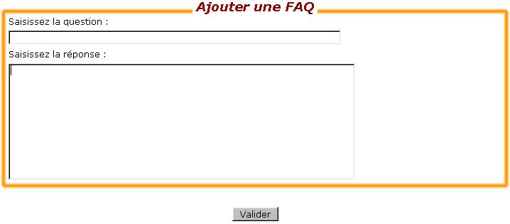 Saisissez dans la première zone de saisie votre question. Saisissez dans la deuxième zone de saisie votre réponse. Cliquez sur le bouton Valider pour ajouter à votre FAQ cette question et sa réponse. Sélectionnez la FAQ que vous souhaitez éditer et cliquez sur le bouton "editer "