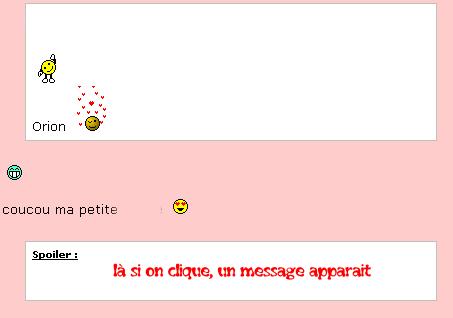 | salut Yack comme promis......................j'ai une nouvelle demande j'ai déjà vu que ça a été posé, mais il est bon parfois de remettre l'ouvrage sur le métier......................... c'est komeçakondi hein ? y aurrait-il moyen (dis oui, dis oui, dis oui, dis oui, dis oui, ) de créer des spoilers ? c'est un truc du genre : là on tape ce qu'on veut.............et blablablabla