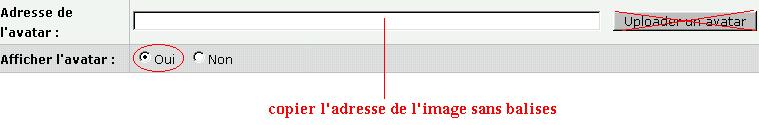 ___________________________________________________________ Déposer un avatar depuis un hébergeur Sur le forum, cliquer sur le bouton et cocher la case Oui devant Afficher mon avatar recopier le l'url de l'image sans mettre les balises [img]